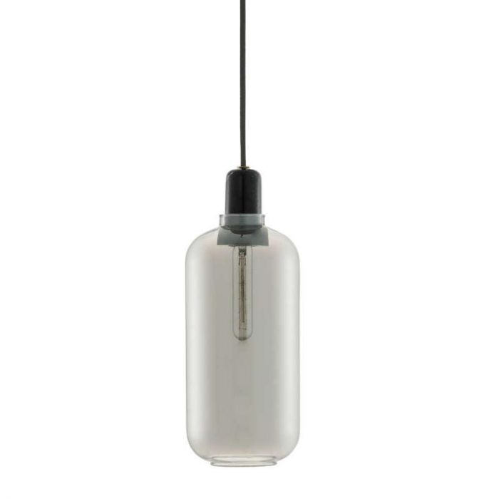 Amp large hanglamp van Normann Copenhagen is ontworpen door Simon Legald. Amp is geïnspireerd op de buizenversterkers uit de jaren '60/70 en gemaakt van marmer en glas. De fitting is gemaakt van zwart marmer en de diffuser van rookkleurig glas. Amp wordt geleverd met een 4 meter lange textiel kabel.